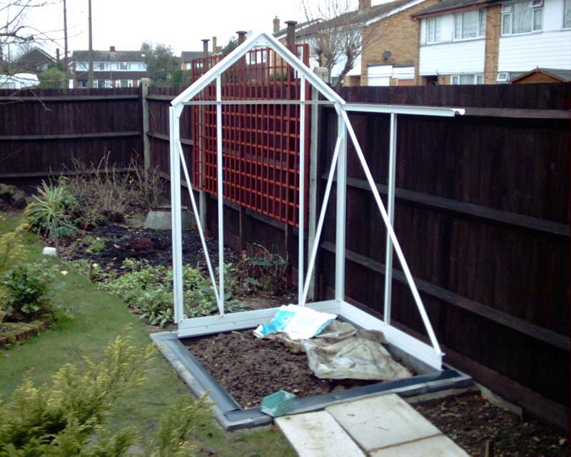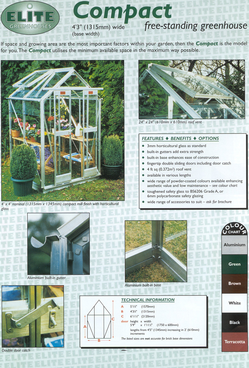 After looking at various greenhouse designs it was finally decided that The Elite Compact would be the most appropriate for the small garden. www.elite-greenhouses.co.uk. Unfortunately, this site does not show a picture of the Compact model, but see below.