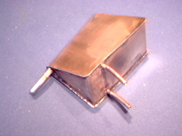 A new and slightly smaller fuel tank. The pipes were silver soldered into the framework before the two parts were soft soldered together. This makes the initial setting up of the parts a little harder but greatly simplifies the final soft soldering. Click here to go to the plans page The weight saving was 12 g. |